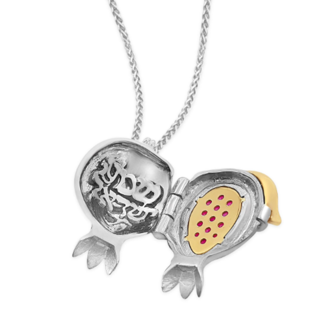 14K Gold Sterling Silver Ruby Shema Yisrael Pomegranate Locket Necklace